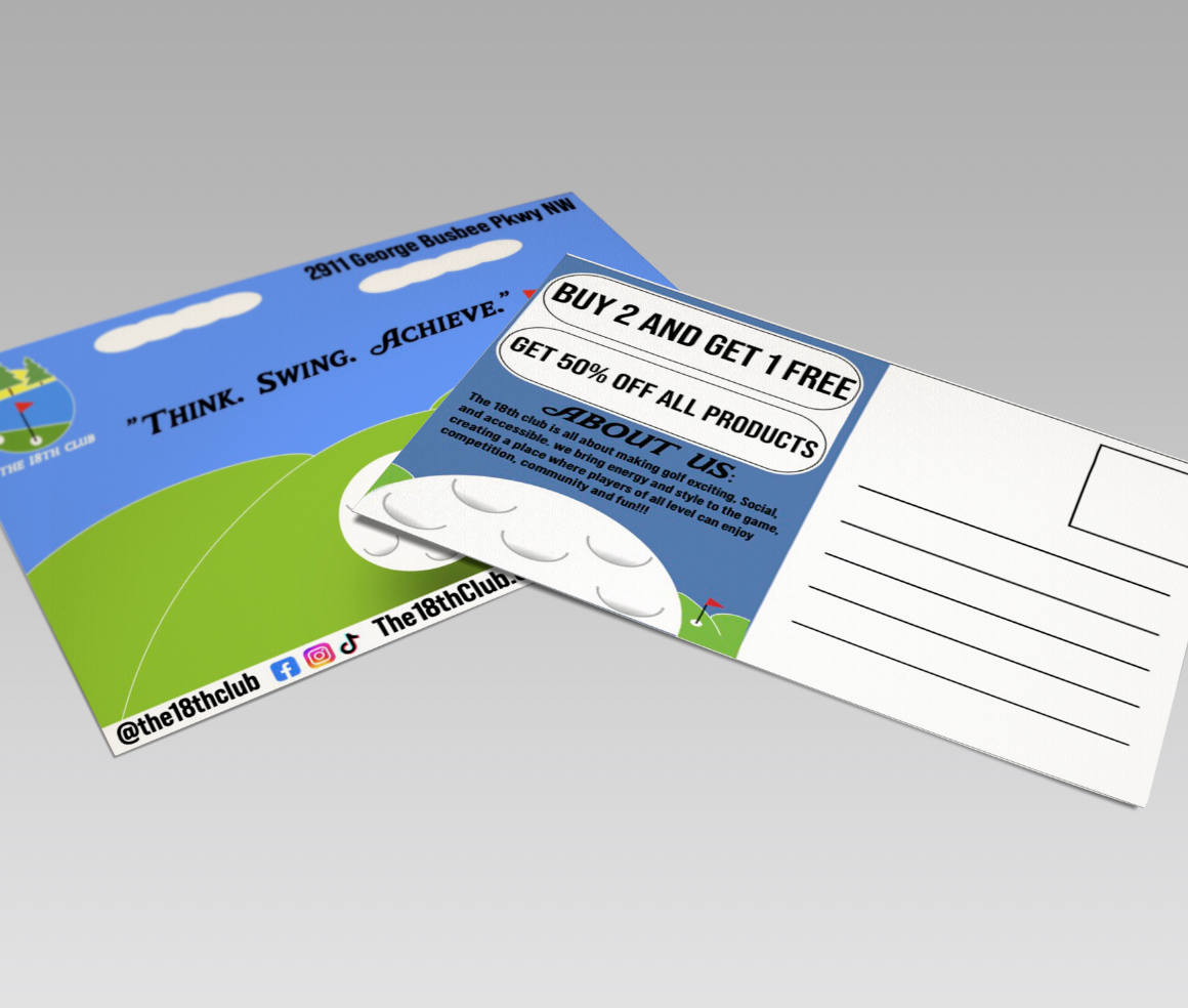 This branding project involved creating a cube-shaped package using a custom dieline. The concept centers around a mini golf brand aimed at an 18–30-year-old audience, supported by cohesive brand elements such as a promotional postcard.